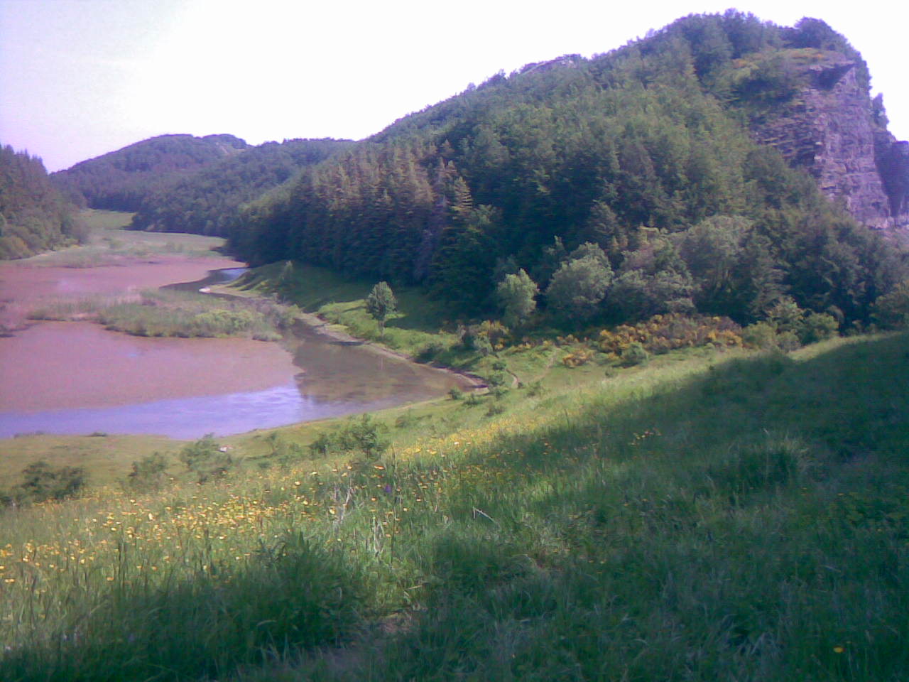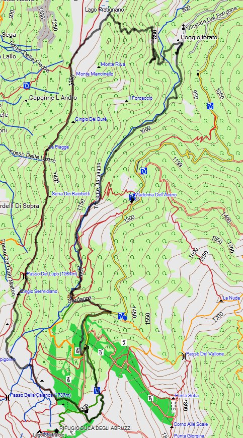 | Karte z.B. Carta dei Sentieri e dei Rifugi 1:25000 Nr 21 Appennino Toscoemiliano Edizioni Multigraphic - Firenze Anfahrt: Lizzano in Belvedere-Vidiciatico-dort Straße zum Corno alle Scale, nach 2-3 km Abzweig nach Poggiol Forato dort Parkplatz. Von Poggiol Forato zum Lago Patrignano: Im Weiler Sträßlein ins Bachtal Richtung Westen, auf Brückchen über Bach. Der Weg ist auf der Karte eingezeichnet ohne Nummer, aber er ist im Gelände (nicht üppig) markiert. Habe mich, wie am abgebildeten Track zu sehen ist, einmal verlaufen, und war in diesem verbuschten mit Felsabbrüchen durchsetzten Hang froh, mittels GPS-Gerät auf meiner Spur zurückgehen zu können. Weg ist wohl kaum gewartet, teilweise leicht ausgesetzt, bis er in das bewaldete Aufstiegstal einbiegt. Vom verlandenden Lago aus südlich auf der Höhe auf guten, markierten (auch Wegweiser) Pfaden bis Passo del Lupo und Cingio Sermidiano. Von dort südlich dann südöstlich auf Weg 409 ins Talrund untrhalb von Il Cupolino und Corno. Doe auf der Karte eingezeichneten Gasthäuser sind wohl nur zur Skisaison geöffnet. Um zum Rif. Duca degli Abruzzi auf dem Cupolino aufzusteigen, fehlen mir leider Kraft und auch Zeit,. auch zieht Regen auf mit fernem Donnermurmeln. So lasse ich auch den Corno Corno sein, gehe auf der Straße bis zum Restaurant Il Cavone, von dort auf 337 zur Cascatade Dardagna, und am Bach entlang zum Parkplatz in Poggiol Forato. Fazit: Die Landschaft am Skigebiet langweilig, vielleicht hätte sich von der Höhe (Cupolino, Corno) der Blick nach Süden gelohnt. Sonst hübscher Weg, der Anstieg von Poggiolforato zum Lago herausfordernd. In tieferen Lagen ist die Landschaft sicher abwechslungsreicher und malerischer..... Download des Tracks |