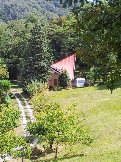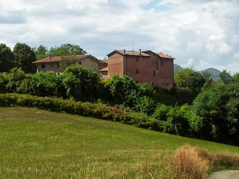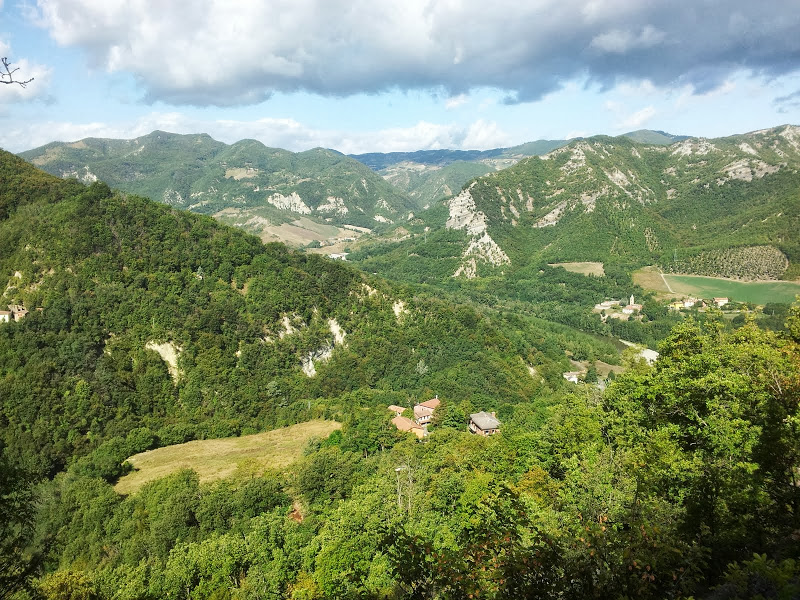 ![]() Blick ins Renotal. Im Vordergrund unten Ca dei Schiavi. Die Kirche unten sieht aus wie die von Salvaro, aber es ist wohl die Kirche Madonna del Bosco auf der anderen Seite des Reno. |