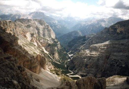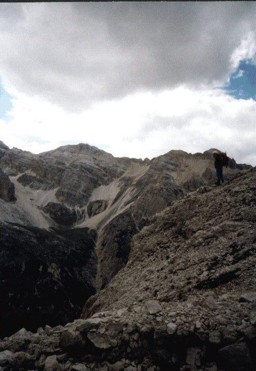 Erst mal aber nach all dem grauen Schutt empfing uns der saftige Talgrund, und es gab auch einen recht passablen Weg hoch ins Hochkar, ein paar Leiterstufen, und ab und an beklemmende Perspektiven, aber wirklich Fußweg. Oben das Rifugio Giusiani ist auch ehemals militärisch: italienische Seite. Das ganze schräge Hochkar konnte vom Monte Castello aus eingesehen und beschossen werden, an seinem Ende liegt Giusiani. Eine Gedenktafel erinnert daran, dass die Italiener hier einen Überfall der Österreicher abgewehrt haben. Demnach waren die Österreicher auf demselben Weg wie wir eben durch den Canon, das Hochkar hinan, wo ich vor den Bergen Angst hatte, mussten sie noch den Feind fürchten. Umgekehrt: Weit unten im Kar waren kleine Unterstände für italienische Vorposten, die wohl genau solche Überfälle verhindern sollten. Bei Wachablösung hatten die Soldaten das ganze den Österreichern offen darliegende Gelände zu überwinden... Heute ist die Hütte natürlich Ausgangspunkt für Klettersteige und Touren in den Tofanen. Das Foto zeigt den Blick vom Hochkar zurück zum Abstiegshang unter dem Monte Castello. Der tiefe Talgrund ist nicht zu sehen. Rechts schaut mein Freund Wolfgang gerade den steilen Anstieg hinunter, den wir gerade hinter uns haben. Irgendwo im Zackenkamm gegenüber, vermutlich rechts, ist der Monte Castello, von dieser Seite nicht ausgeprägt.