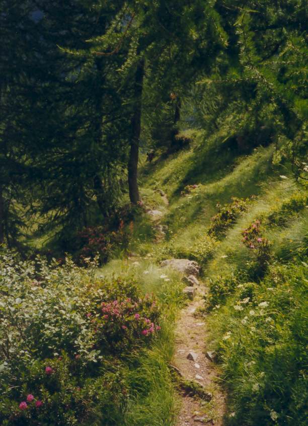 Abstieg nach Corcoforo. Das Hotel Alpenrose liegt unterhalb des schönen alten Ortskerns, an der Straße talauswärts. Frau Dellavedova sagte, der Posto Tappa sei geschlossen, weil sie am Umbauen sei. Wir mußten es glauben und in ihrem Hotel übernachten (ca 70 DM Halbpension). Sie spricht etwas Französisch und Spanisch. Sie empfahl uns das Restaurant ihrer Schwester in Rima. Sie wollte nicht für uns die Reservierung im P.T. von Rima vornehmen, anscheinend liegt ihre Familie mit dem Betreiber der P.T. in Rima im Zwist. (Dellavedova ist auch der Name des Künstlers, dem in Rima ein Museum gewidmet ist.) |