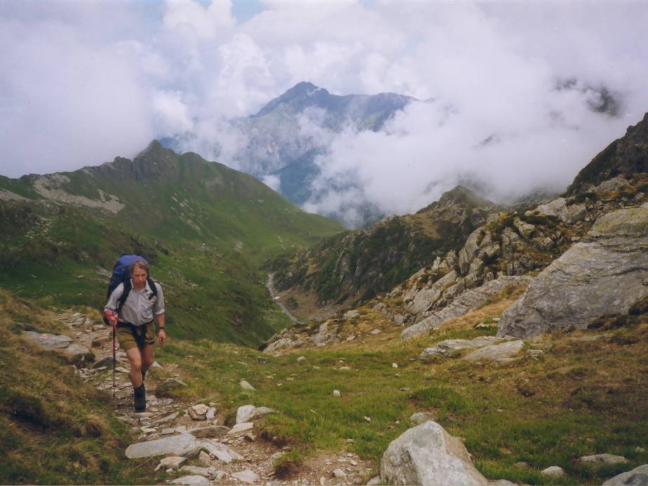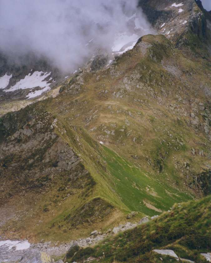 Die letzten Schritte am Col d´Egua. Man sieht, dass trotz des stabilen Wetters der Himmel mittlerweile bewölkt ist, die im Führer versprochene Aussicht auf den Monte Rosa war bereits verhangen. Rechts Blick von einem kleinen Gipfel: Der Egua-Pass ist die zweite Vertiefung im Gratverlauf, also hinter der grünen Fläche. |