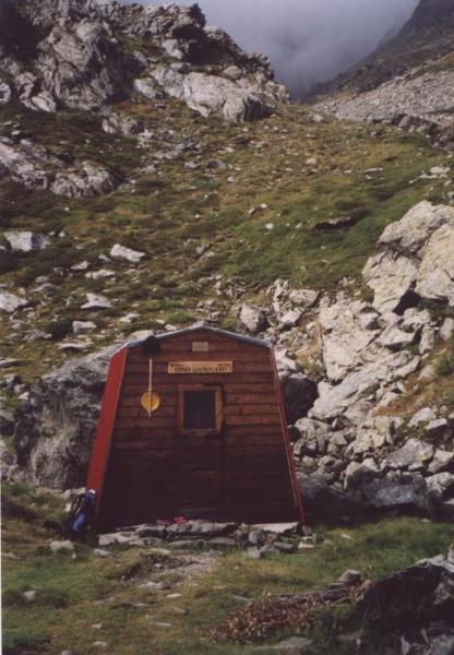 Steinblocklandschaft, am Ende ein properes Bivacco (Biv.
