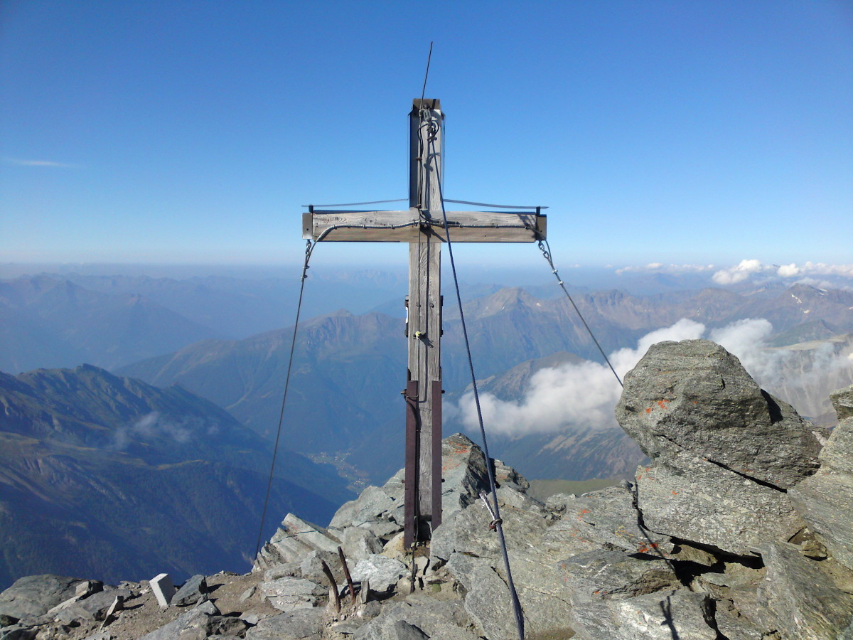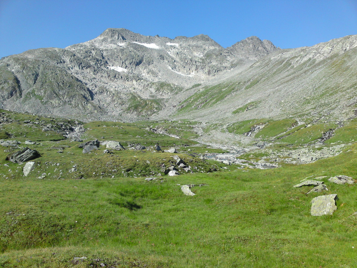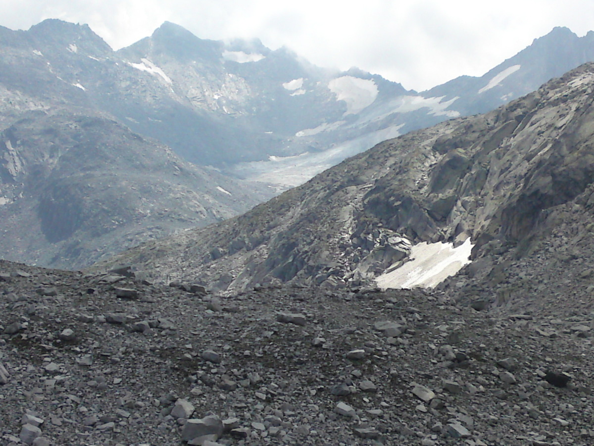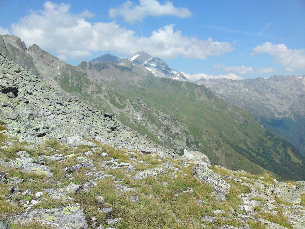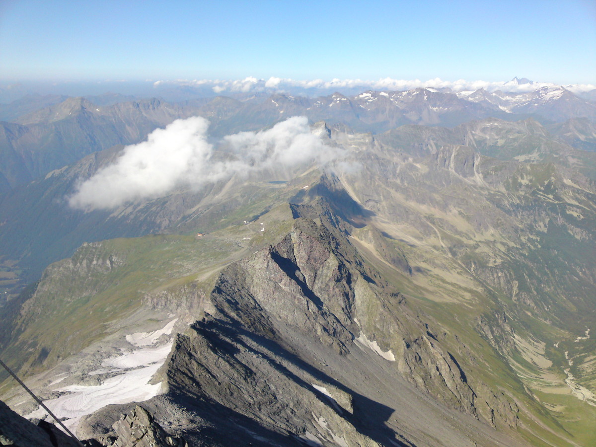 Senke der See sich wohl versteckt. Über den Wolken am Horizont der Großglockner. Ihm vorgelagert, unterhalb der Horizontwolke, rechts der Hocharn, links der Sonnblick (spitz), an dem die Tour enden wird. |