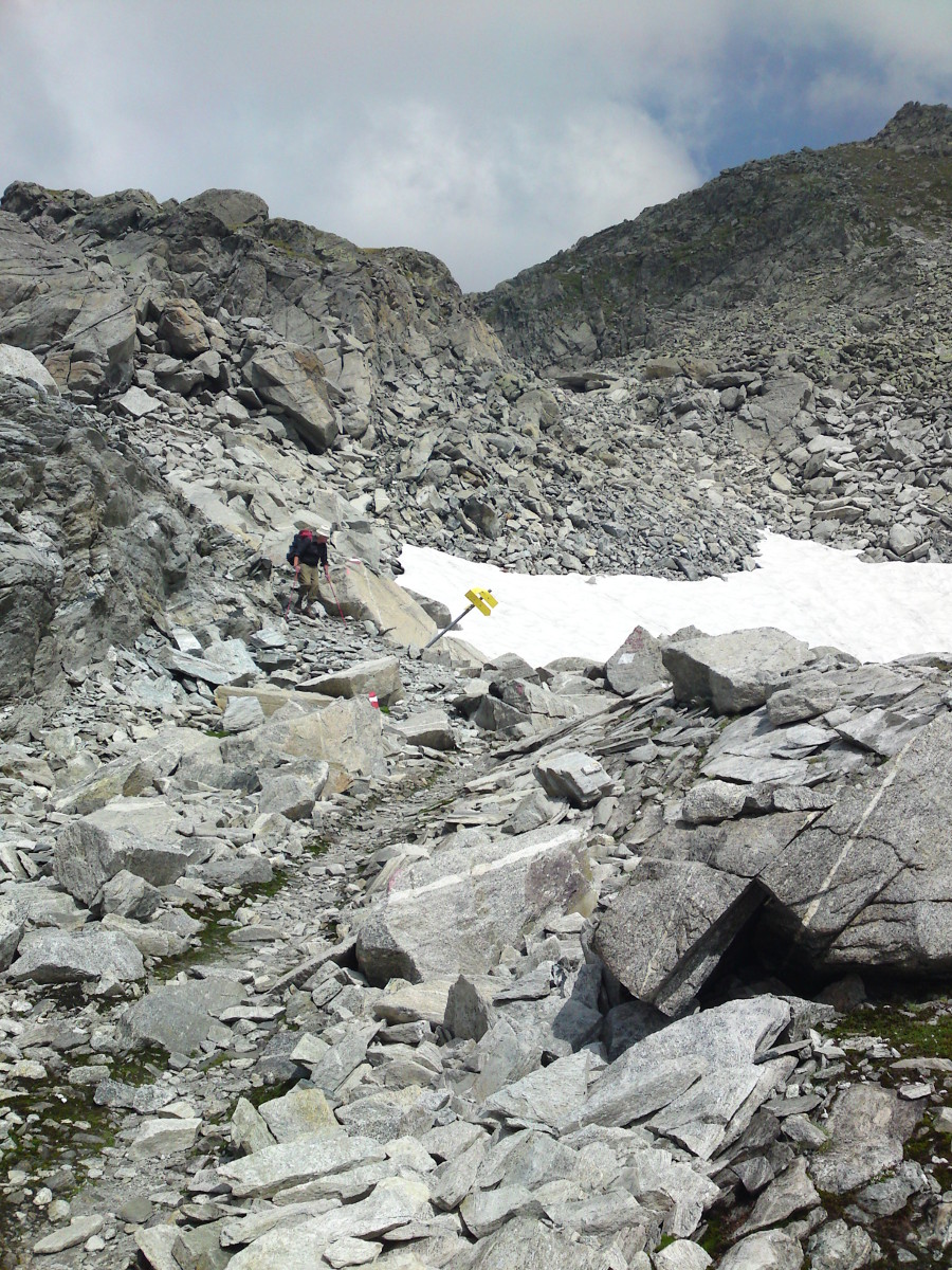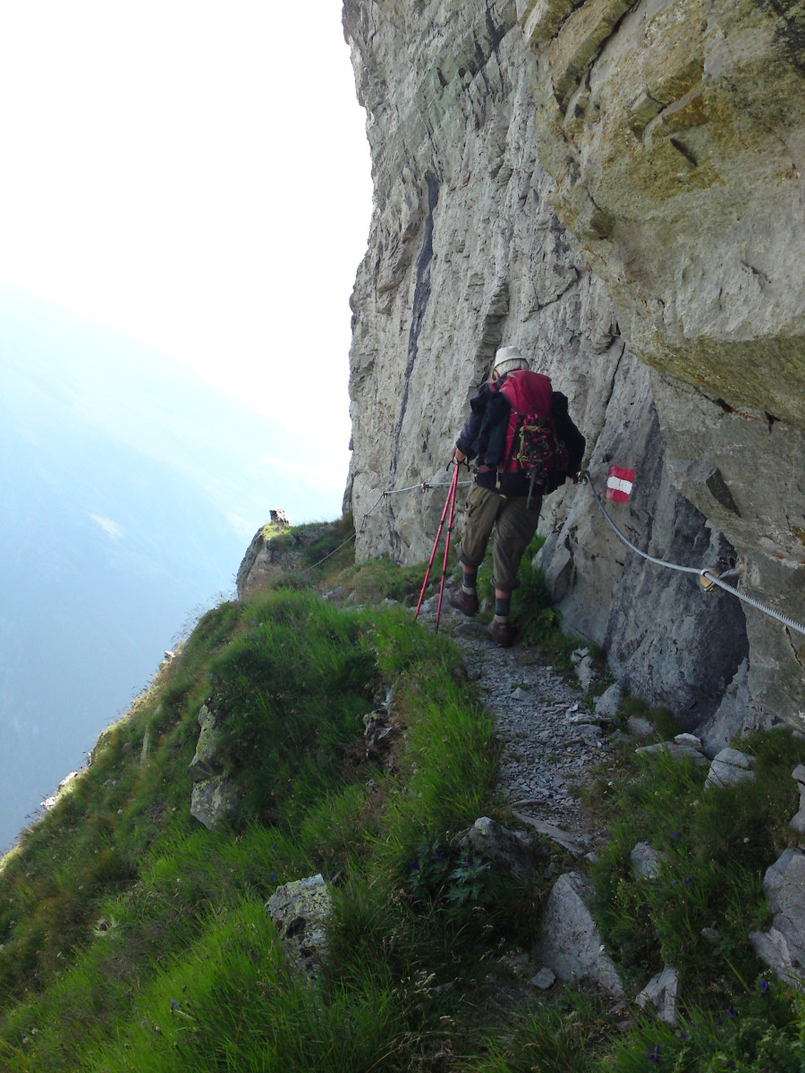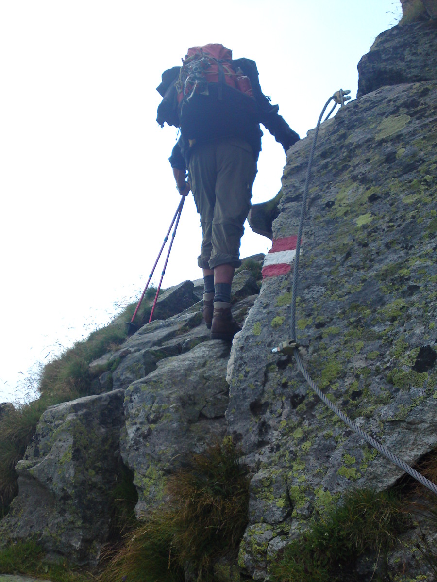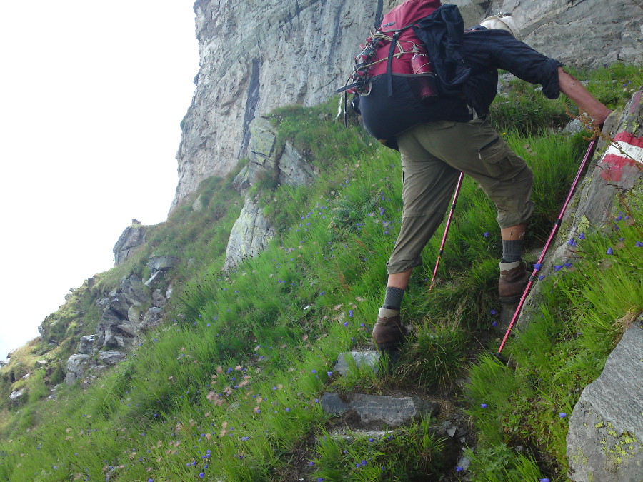 Charakter des Weges: Wird als anspruchsvoll bis sehr anspruchsvoll beschrieben. Da wir an keiner heiklen Stelle Nässe, Schnee oder Eis hatten, fand ich persönlich den Weg nicht schwierig, und hatte an den schmaleren Stellen (z.B. Kleinhap) kaum Angst. Die offizielle Einteilung in rote oder schwarze Wege (weshalb bloß hat der DAV nicht das wunderbare Schweizer Model mit T1 bis T6 übernommen???) war für uns, vielleicht wegen der nun sehr günstigen Umstände, nicht nachvollziehbar: Wir fanden den Weg zwischen Hannover und Minden eher am schwierigsten, da gab es sogar Stellen, an denen wir eher als an Kleinhap ein Drahtseil gespannt hätten,- aber wie gesagt, bei Nässe oder Schnee kann das ganz anders aussehen. Unsere Etappen waren bis maximal 4,5 Std. Gehzeit geplant: W. Mit seinen 80 Jahren brauchte dann aber für diese (früher hätte er gesagt:) halben Ruhetage 9 bis 11 Stunden (inklusive Pausen). Da das Gelände dann doch zu gefährlich war, ihn alleine zu lassen, habe ich die Tage hinter ihm sozusagen durchgestanden. Wenn ich die letzte halbe Stunde zur Hütte vorausging, dauerte es 1-3 Stunden, bis er nach kam, das heißt, bis dahin wurde mir bang und ich ging zurück ihm entgegen. Immerhin hat er die Etappen bis zur Hagener Hütte geschafft, dank seiner immensen Erfahrung, und ich konnte lernen, ohne Hektik im Vertrauen auf das (zum Glück) gute Wetter in Ruhe die Länge des Tages zu nutzen. W. Ist von der Hagener Hütte nach Sportgastein abgestiegen.