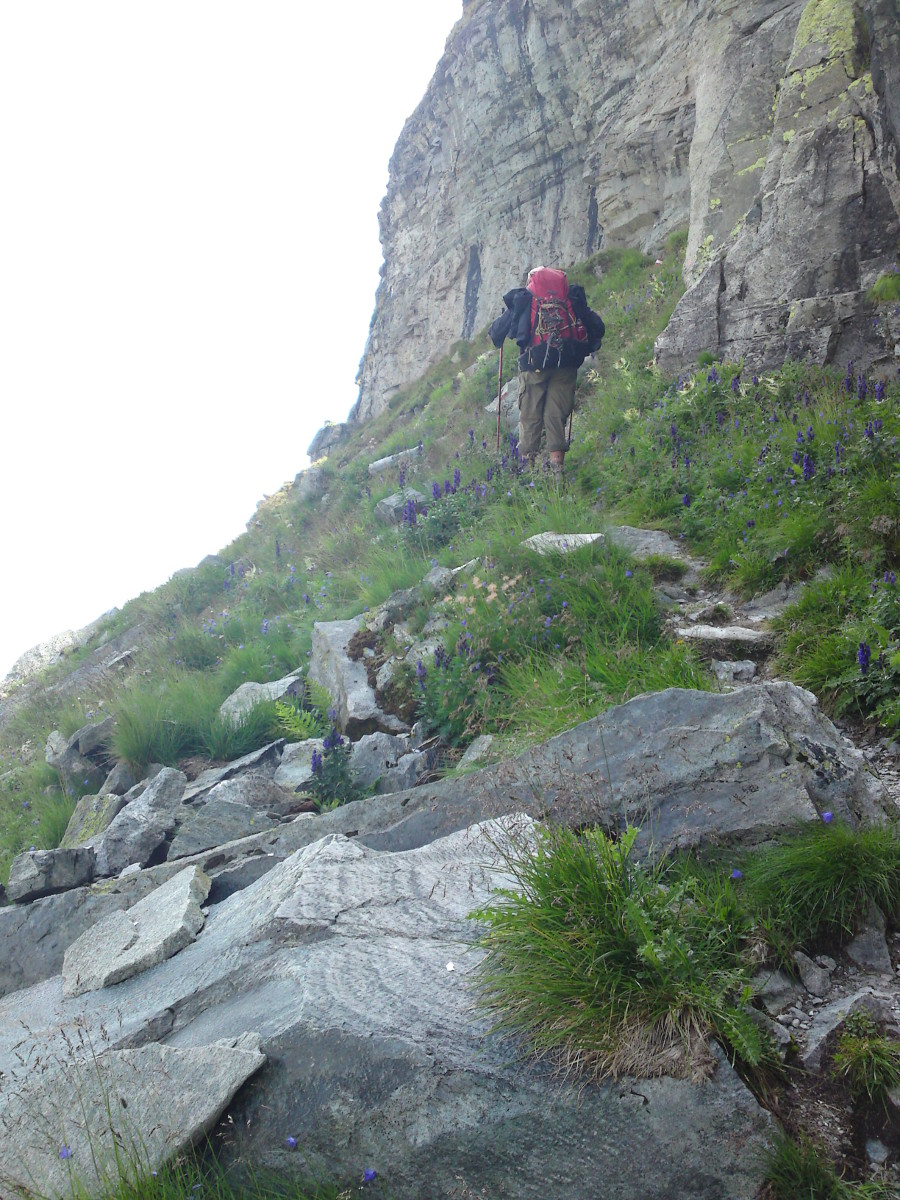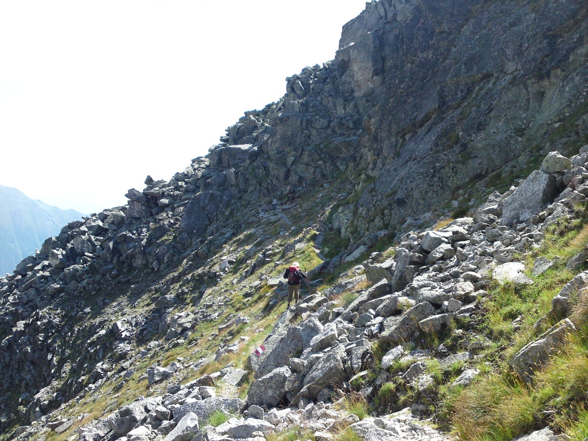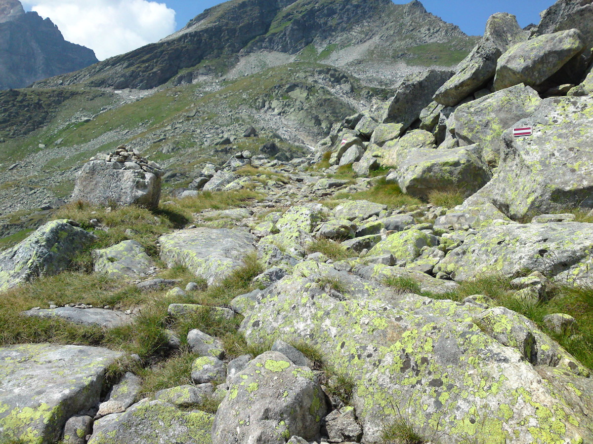 in der Bilderreihe unten. Nach Kleinhap sind längst nicht alle Schwierigkeiten vorbei: Den Tälern entsprechen Einbuchtungen des Weges, Bachkerben und Blockfelder sind zu durchschreiten, der Weg zieht sich also etwas länger, als W. es vermutete. Dennoch: Lob an die Wegebauer, die unglaublich viele Blockfelder durch flache Platten entschärft haben. (Ich persönlich allerdings dachte zeitweise: Auf so einem flachen Bürgersteig kann ich auch zu Hause gehen). |