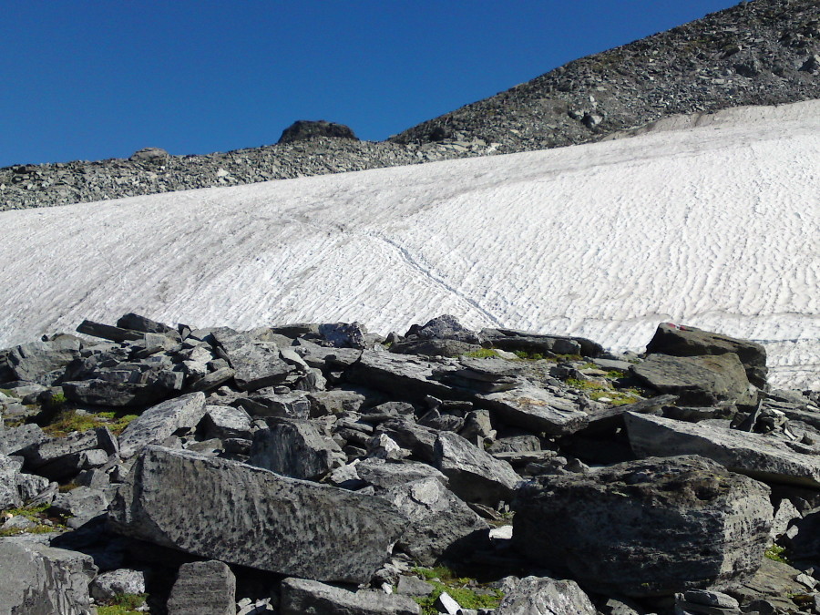 | Dieses Schneefeld war, als ich aufstieg, noch gefroren, so dass ich, sorgfältigerweise, Grödel anlegte. | Blick