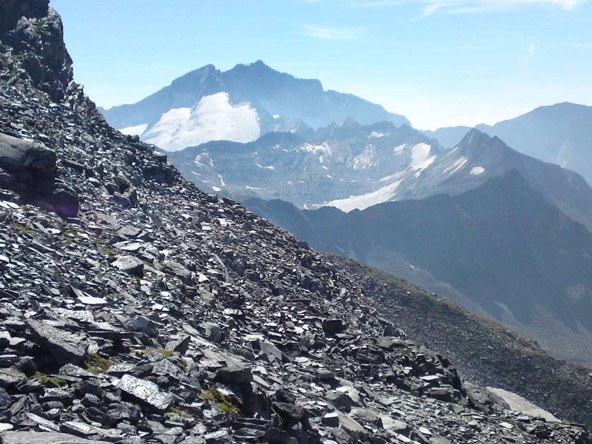 Die Südflanke des Ankogel von der Großelendscharte aus. Rechts: Abstieg von der Großelendscharte. Mit wie viel Mühe wurde wohl der Weg so komfortabel durch die Steine gebahnt! |
