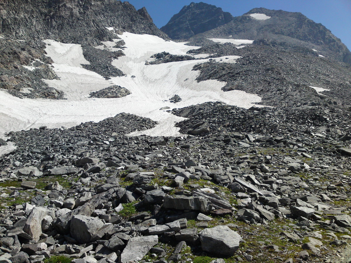 Blöcken, Geröll, Gletscherresten und kleinen Seen, von