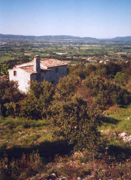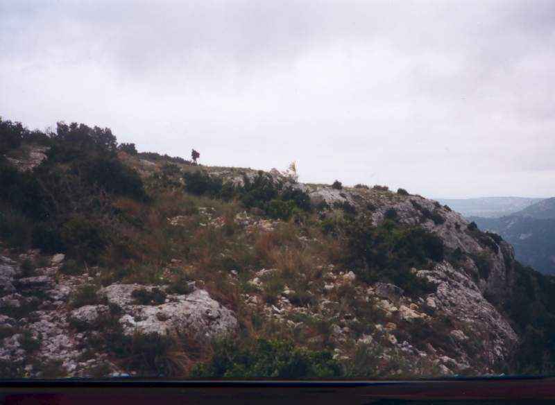 Auch beim Abstieg schöne Felsen, Schuchten etc. Irgendwann muss wohl die Wegmarkierung anders gewesen sein als auf der Karte, denn wir wurden in eine sehr enge, teilweise weniger als 1 m breite Felsschlucht geführt, es müssen die Gorges de Regalon gewesen sein. Bei dem heftigen Regen wurde der Grund der Schlucht zu einem tiefen Bach, 10 Minuten nach uns war sie vielleicht nicht mehr passierbar, wir kamen mit reichlich Wasser in den Schuhen davon. Unangenehmer war das Gefühl, die Position auf der Karte nicht mehr angeben zu können und auch nicht erklären zu können, weshalb wir dann wieder auf einem breiten Forstweg mit Markierungen landeten. Danach schlug ich eine Abkürzung vor, machte dabei einen Fehler, und unser Weg verlor sich nach einer Stunde Marsch in der Heide. Es war nebelig, Suchbewegungen ergaben, dass wir uns auf einer hohen Klippe befanden, auf drei Seiten ging es steil runter, teils in Felsabbrüchen,- und immer noch konnten wir nicht ins Tal schauen um uns zu orientieren. Ich ärgerte mich maßlos über meinen Fehler, wir waren müde und reif für einen warmen Trockenraum. Schließlich entschieden wir uns doch, einem undeutlichen Pfad zu folgen, und an scheinbar nicht gangbarer Stelle erreichten wir ein Tal mit kleiner Teerstraße. Das Glück wurde perfekt, als ein Auto anhielt, und uns die letzten vier Kilometer nach Merindol mitnahm. Wir waren nicht völlig falsch gewesen, aber bei dem Nebel hatten wir dies nicht feststellen können. Das Gite in Merindol ist gut geführt, die jungen Wirte zeigten sich interessiert an den vielen kleinen Schicksalen von uns Wandergästen und erfreut über den Beifall zu ihren Kochkünsten - Frankreich -.