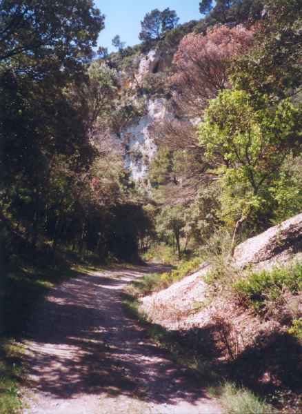 Wir überquerten den Luberon praktisch am Westende des Grand Luberon. Der Abstieg führte uns nach Bioux. Etwa eineinhalb Stunden vor Bioux trennten wir uns, Wolfgang ging geradeaus weiter, sah unten in der Schlucht an den gigantischen Falaises Kletterer. Ich nahm einen hübschen, aber nicht mehr markierten Weg, der im Prinzip parallel zum Hang führte, weiter östlich wollte ich den GR 9 gewinnen und auf ihm zum Gite nach Bioux. Der teilweise aufgemauerte Weg droht leider zuzuwachsen. Zuweilen imposante Blicke auf Felsgebilde und in die mächtige Schlucht. Orientierungsprobleme, zumal ich dann noch auf wohl veraltete GR-Markierungen stieß. Der Weg endete in einem Privatgrundstück, - deshalb auch keine Markierung mehr, und deshalb war die angetroffene GR-Markierung nicht mehr aktuell. Auch hier bei dem Haus etwas ratloses Suchen, aber dann stieß ich auf den GR9. Runter in die große Schlucht, bei einer Art Mühle da unten ist ein großes Reataurant. Ein wasserreicher Bach, Talkühle! Auf einem in den Fels gehauenen Mulisteig auf der anderen Seite hoch, zunächst oben an der Felskante entlang mit vielen Aussichtspunkten, und dann auf denkbar ungünstigem Weg nach Bioux. Das Gite dort ist sehr sehr schön. Abendessen in Form eines Buffets mit lauter Delikatessen.